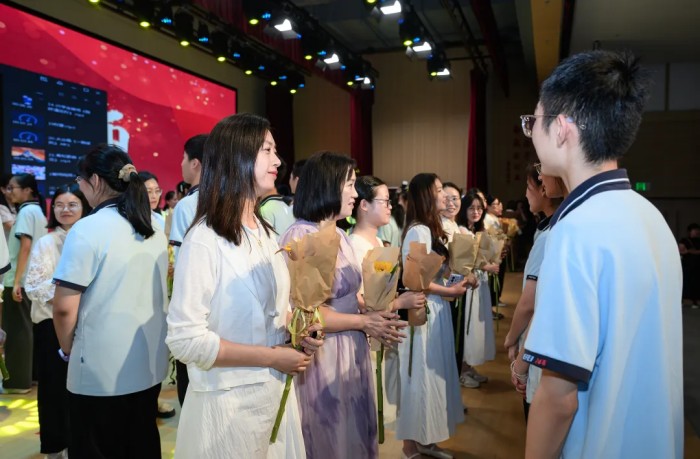 九年级学子深情朗诵《忆·玫瑰好时光》,翻开感恩篇,带大家重温校园里的点点滴滴,表达对老师们辛勤付出的感激。随后,全体九年级教师登上舞台,毕业生代表为各位老师献花。同学们的成长离不开家校齐心合作,接着,家长代表上台,各位班主任为他们献花,感谢各位家长朋友三年来对学校、年级和班级工作的帮助和支持。