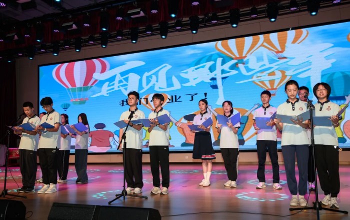 最后,全体师生齐唱校歌,并在《一路顺风》的歌声中互道珍重。典礼的最后,全体老师上台合唱歌曲《再见》,为这场青春盛典画上温情的句号。同学们迟迟不愿离去,他们纷纷走上舞台,眼含热泪,与恩师们深情相拥合影,留下珍贵而难忘的青春记忆。