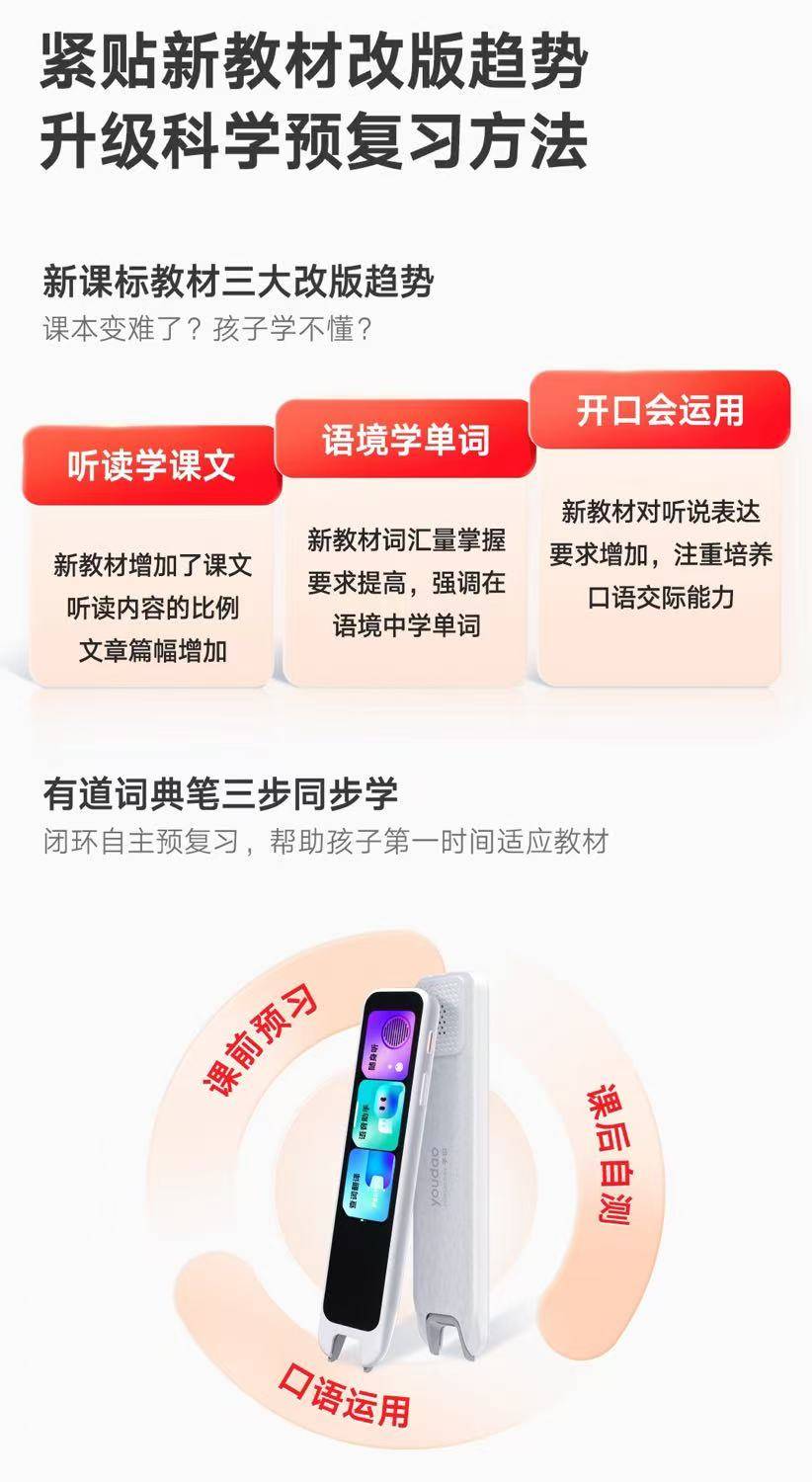 在契合新课标方面,有道词典笔A7的设计思路不仅体现在单词学习功能上,还体现在重点引入了全国主流新教材的正版内容。从教材原声发音到课本同步学习,该产品将新课标学习方法贯穿整个学习过程。孩子可以跟随原版课文进行听读预习与复习,利用supermemo记忆法进行单词听背,并结合情景对话练习巩固。这不仅有助于孩子更好地理解和记忆课程内容,也能提升语言运用能力。