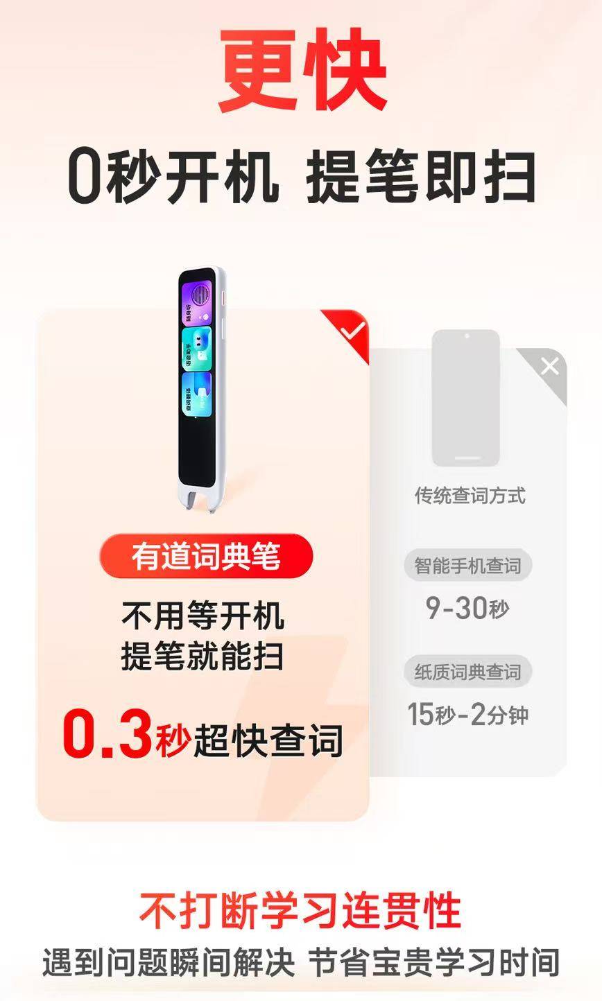更高的效率通常意味着更佳的学习成效,有道词典笔A7改变了传统词典笔需先开机再使用的模式,实现了无需等待即可扫描,让学生在使用过程中完全省去等待时间,有效提升了学习的流畅性与连续性。