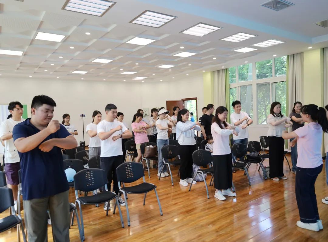 “握握手 点点头 碰碰肩......”伴随着欢快的音乐、小朋友和大朋友们的欢笑声,体验活动开始。