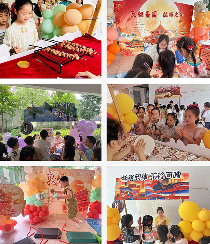 各学科以丝绸之路为文化纽带,为一年级学生打造沉浸式探索之旅——美术课在长安站,学生通过观察泥塑作品,解码揉搓捏刻的基础技法,触摸千年艺术底蕴;体育课在敦煌站,孩子们背起沙包穿越独木桥障碍,模拟丝路商队的平衡智慧;语文课于吐鲁番站,学生观察葡萄丰收图景,用扩句训练串联劳动场景与分享美德;科学课借乌鲁木齐站的羊肉串香气,通过孜然气味辨别开启感官探索之旅;音乐课从喀什站的手鼓节奏中捕捉驼铃韵律,感受音乐魅力;道德与法治课在塔什干站,通过手抓饭食材分享活动,诠释食物传播中的友谊温度;数学课化身为列宁斯克商道上的运货智囊,用四则运算破解骆驼队行程难题。七大关卡让知识传递与文化浸润自然融合,为低年级学生带来全新的学习体验。