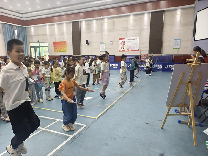 “绳彩飞扬”将体育锻炼融入测试。随着跳绳开始的指令响起,孩子们迅速挥动手中的跳绳,双脚轻盈跳跃,绳子在空中划出一道道优美的弧线。他们活力四射的身影,展现出良好的身体素质和运动能力。