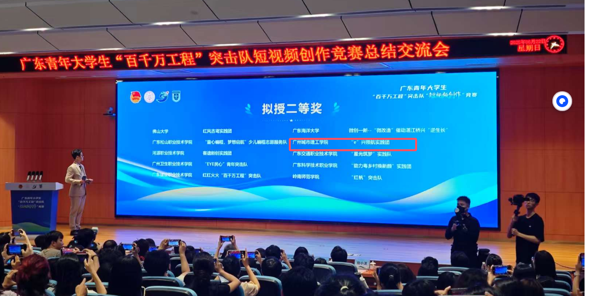 6月22日,广东青年大学生“百千万工程”突击队短视频创作竞赛总结交流会在广东财经大学(广州校区)正心堂举行。会上公布了拟获奖名单,广州城市理工学院马克思主义学院“Young实践团”创作的短视频《传承醒狮文化,锻造中华风骨》和计算机工程学院/大数据学院“e”兴领航实践团《凝青春力量,促乡村振兴》均荣获二等奖。