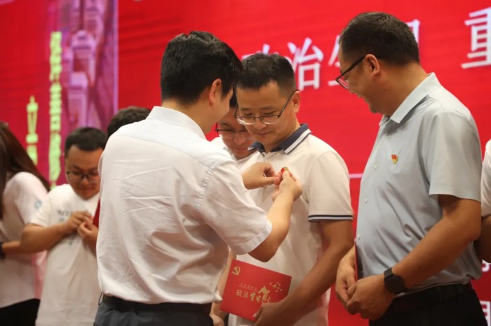 会议开启,16位入党时间在6、7月份的党员教师齐聚台前,接受党组织的关怀与祝福。学校党支部书记陈炳炎、副书记张莉莉为他们送上政治生日贺卡,传递组织关怀与嘱托。校领导为不同党龄阶段的代表郑朝晖、胡亚魁、黄雪老师佩戴党徽,台上其他党员教师也一同完成佩戴,一枚枚党徽熠熠生辉,时刻提醒全体党员牢记身份。随后,郑朝晖老师带领全体党员重温入党誓词,铿锵有力的入党誓词回荡在会场,让每一位党员的心灵再次受到震撼与洗礼。