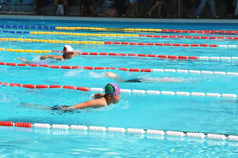 随着发令笛响起,8条泳道瞬间化作水上竞技赛。参赛选手如离弦弓箭跃入水中,劈波斩浪奋勇争先,泳池内浪花翻项,选手们标准泳姿,强劲有力的动作尽显竞技风采。精彩表现引得观众鼓掌呐喊,喝彩声此起彼伏。