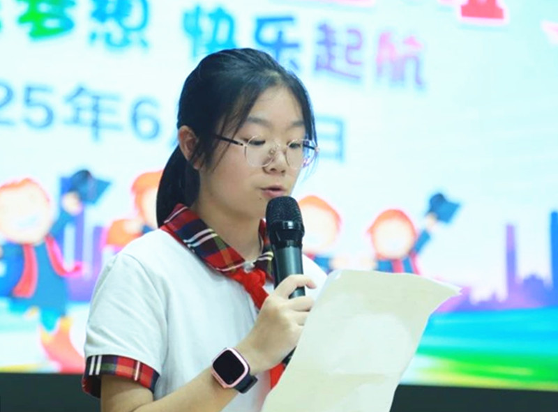 毕业生代表冯楚乔同学,用真挚而充满童真的话语,表达了对母校、对老师深深感恩和对同学的依依不舍。她代表全体毕业生承诺,将牢记教诲,努力学习,不负期望。