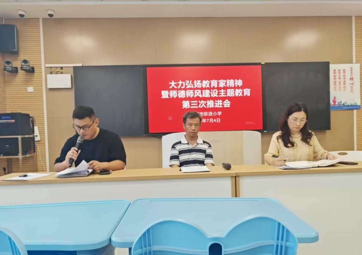 为深入贯彻落实党的教育方针,进一步加强师德师风建设,弘扬教育家精神,7月4日,合肥市跃进小学组织召开了大力弘扬教育家精神暨师德师风建设主题教育第三次推进会。全体教师齐聚一堂,共同参与了此次意义深远的活动。