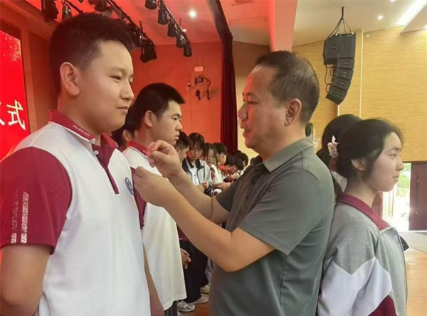 校团委书记方祥琴宣读批复文件。经过层层选拔、学习和考察,45名品学兼优的同学光荣地加入了共青团,为学校团组织注入了新的力量。在热烈的掌声中,与会老师为新团员佩戴闪耀的团徽,金色徽章在胸前熠熠生辉,象征着责任与使命的传承,激励大家牢记团员身份,不断砥砺前行。