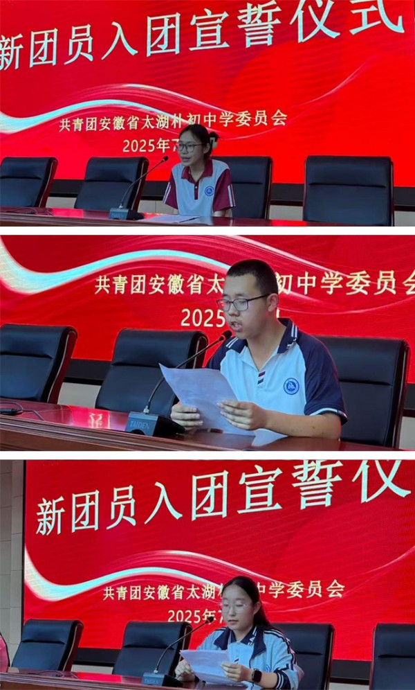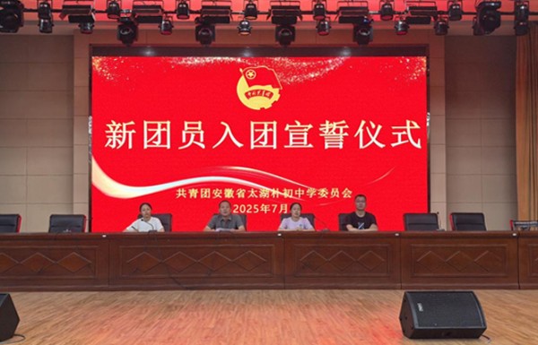 为加强团员理想信念教育,增强共青团组织凝聚力,太湖朴初中学团委于7月2日在校多功能厅隆重举行新团员入团宣誓仪式。分管校长鲁林益,校团委书记方祥琴、校团委委员及新团员共同见证了这一庄严时刻。仪式由团委副书记吴英主持。