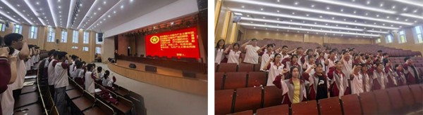 在领誓人王岩松老师的带领下,新团员面向团旗庄严宣誓,铿锵誓言回荡全场。