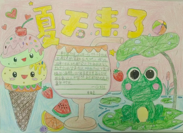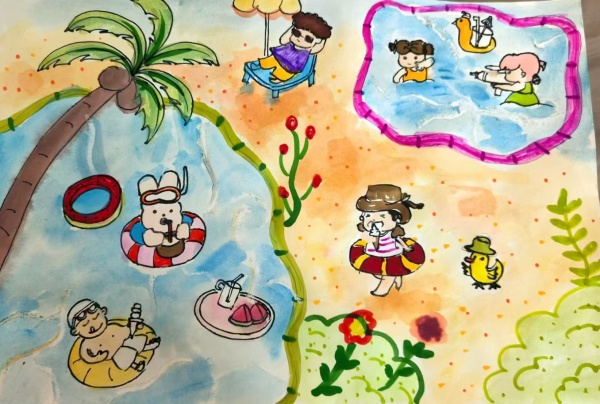 有的勾勒出波光粼粼的泳池,小伙伴们在其中嬉戏玩耍;还有的在小朋友的画笔下,海洋世界梦幻呈现,巨大海豚自由遨游,灵动又神秘……他们的作品充满童趣,每一笔都饱含着对夏天的独特感受与热爱。