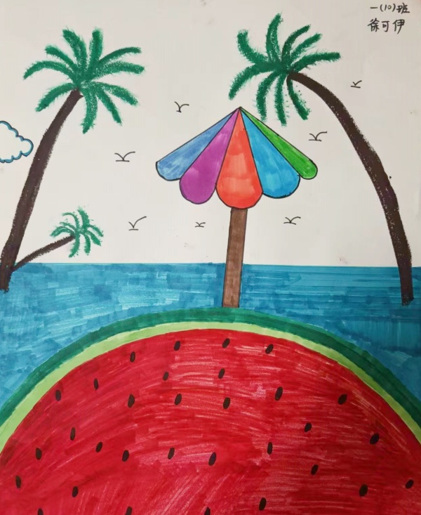 活动中,孩子们手握画笔,专注地描绘着自己心中的夏日。有的孩子画了夏日海滨,几棵椰子树亭亭玉立,沙滩遮阳伞下,清甜西瓜已备好,孩子们游累上岸,围坐大快朵颐,笑声满溢。