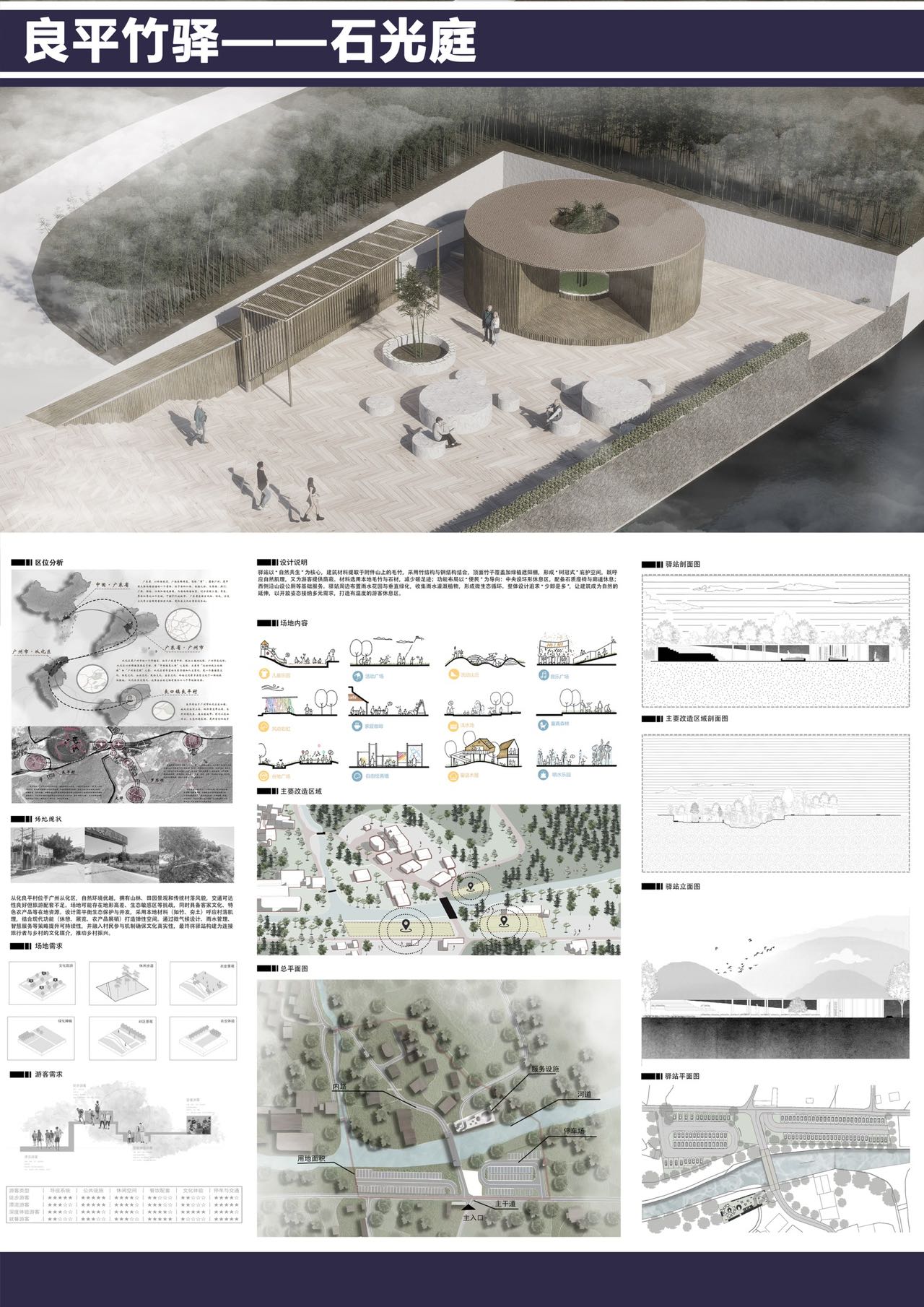 在参赛过程中,广州城市理工学院师生团队深入一线实地调研,走访村民了解需求,踏勘环境探寻本土材料、感受场地肌理,确保设计方案创新性与地方需求深度契合。《良平竹驿——石光庭》方案驿站以"自然共生"为核心,建筑材料提取于附件山上的毛竹,采用竹结构与钢结构结合,顶面竹子覆盖加绿植遮阳棚,形成“树冠式”庇护空间,既呼应自然肌理,又为游客提供荫蔽。材料选用本地毛竹与石材,减少碳足迹;功能布局以“便民”为导向:中央设环形休息区,配备石质座椅与廊道休息;西侧沿山设公厕等基础服务。驿站周边布置雨水花园与垂直绿化,收集雨水灌溉植物,形成微生态循环。整体设计追求“少即是多”,让建筑成为自然的延伸,以开放姿态接纳多元需求,打造有温度的游客休息区。