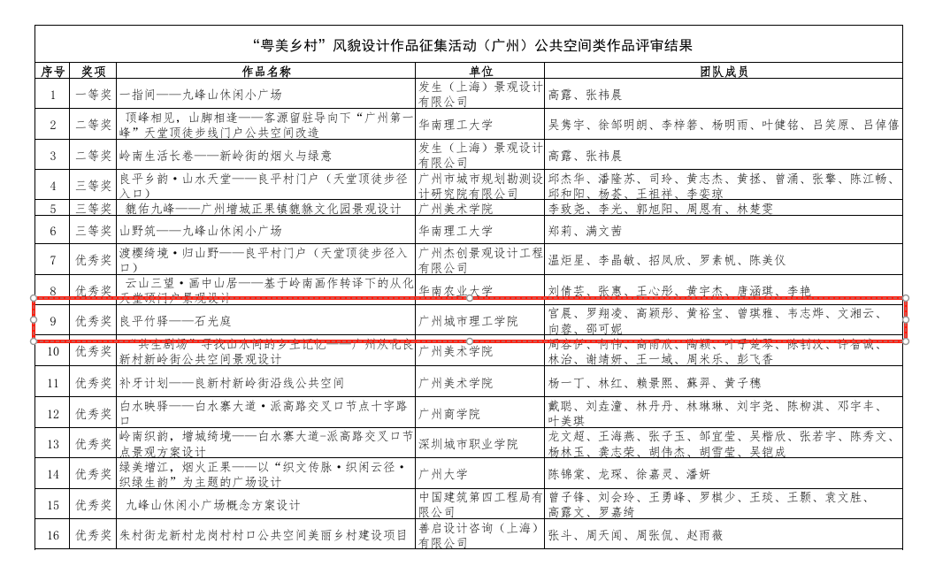 7月9日,“粤美乡村”风貌设计作品征集活动(广州)总结会在广州城市规划展览中心落幕。在与众多国内外一流设计机构、高校团体同台竞技中,广州城市理工学院建筑学院学生团队(高颖彤、黄裕宝、曾琪雅、韦志烨、文湘云、向蓉、邵可妮)在风景园林专业宫晨副教授、建筑学专业罗翔凌副教授指导下,作品《良平竹驿——石光庭》荣获公共空间类(共16个获奖)优秀奖,并获推参加第二届“粤美乡村”风貌设计大赛全省总体赛!