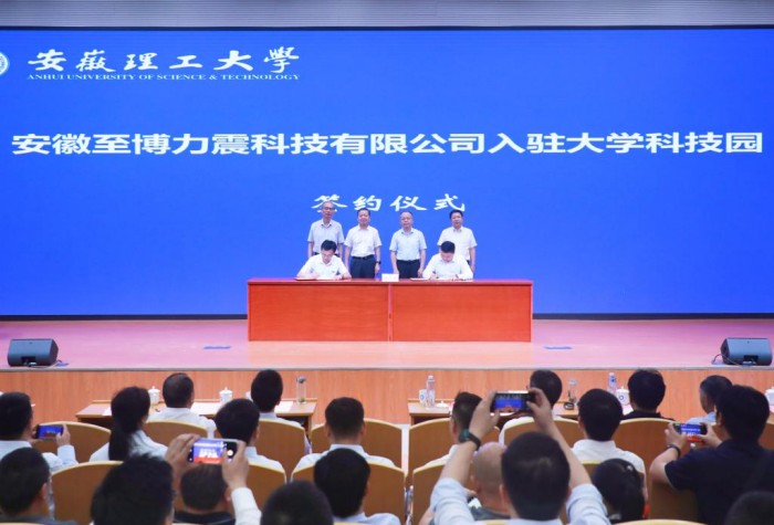 7月26日上午,安徽理工大学科技园入驻企业签约仪式隆重举行,安徽理工大学科技园迎来安徽安理智远能源科技有限公司、安徽至博力震科技有限公司2名新成员。校党委书记郭永存,党委副书记、校长袁亮院士,安徽至博光电科技股份有限公司董事长俞本立,合肥金星智控科技股份有限公司董事长兼总经理吴华峰等见证签约。校领导王献余、王先江、张平松、赵光明、徐良骥出席仪式。校党委常委、副校长徐良骥主持仪式。