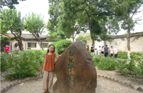 张若愚同学走进了《从百草园到三味书屋》描绘的世界。踏入百草园,仿佛瞬间穿越回鲁迅的童年。园中的皂荚树枝繁叶茂,投下大片浓荫;紫红的桑葚点缀在枝头,散发着诱人气息仿佛能看见那个活泼好动的小鲁迅,穿梭在草丛间,专注地捉着蟋蟀,满心欢喜地采摘着覆盆子,尽情享受着童年纯粹的快乐。不远处便是鲁迅的启蒙之地——三味书屋。踏入屋内,古朴的书桌、微微泛黄的书卷,还有那块刻着“早”字的书桌,一切都散发着浓厚的书香气息,让人不禁心生敬畏。