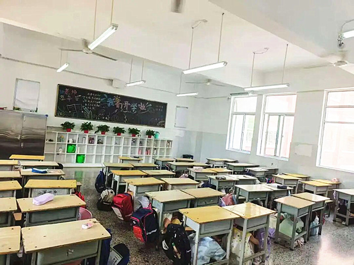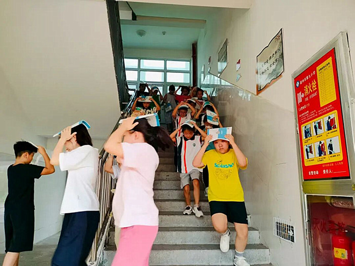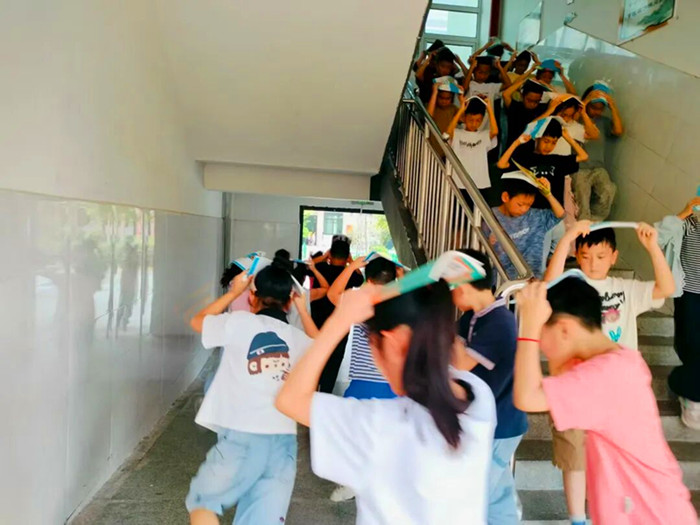 演练开始,随着警报声响起,学生们迅速做出反应。室内学生按照要求,就近躲避在桌下或墙角,用胳膊保护眼睛,抓紧桌腿,以书包等物品护住头部。在第二次警报响起后,学生们在教师的指挥下,用书本等护住头部,有序地从教室撤离到操场指定位置。各年级按照规定区域集合,整个过程迅速且秩序井然。到达操场后,学生们蹲下保护头部,各班立即清点人数,并逐级上报。