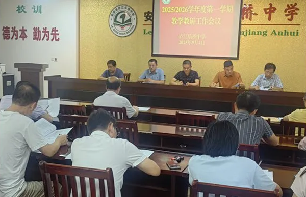 2025年9月4日晚,庐江乐桥中学于综合楼二楼会议室隆重召开2025学年秋季教学教研工作会议。会议由校党支部副书记许家安主持,校长吴量、教务处及教科室负责人、各教研组长与备课组长共同出席,凝聚共识,统筹谋划新学年教学教研发展新篇章。
