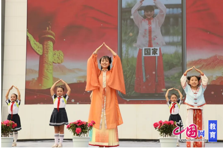 小团子身着宋制童装,翩然登台表演国风舞蹈《宋韵・春鞠》。轻盈的舞步、优雅的身姿,仿佛将大家带回宋代的春日盛景,赢得阵阵掌声。学生演员与小一姐姐携手,表演古诗手势舞《明月几时有》和爱国歌曲手势舞《国家》。手势灵动,歌声悠扬,传统文化与爱国情怀在舞蹈中交融,感染着现场每一个人。全校师生齐声合唱《歌唱祖国》,嘹亮的歌声在校园上空回荡,诉说着对祖国的热爱与对传统文化的自豪。