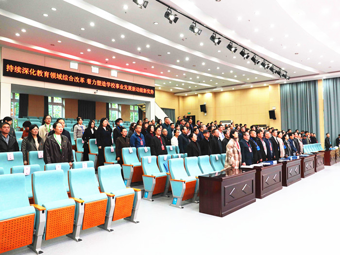 上午8点20分,大会在雄壮的国歌声中正式开幕。陈国龙以《持续深化教育领域综合改革 着力塑造学校事业发展新动能新优势》为题作学校党政工作报告。
