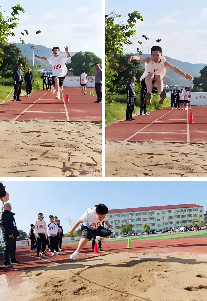 跳远与接力项目同样精彩。跳远沙坑前,运动员反复调整助跑距离,加速、踏跳、腾空、落地,沙粒飞溅的瞬间,定格下最美的跳跃姿态,接力赛场上,运动员如离弦之箭冲出起点,稳稳攥住接力棒,全力向第二棒队友奔去。交接棒环节最为紧张,选手们眼神专注、配合默契,“传、接”动作一气呵成,没有丝毫失误。后续棒次的运动员接过接力棒后,拼尽全力向前冲刺,耳边是此起彼伏的“加油”呐喊声。