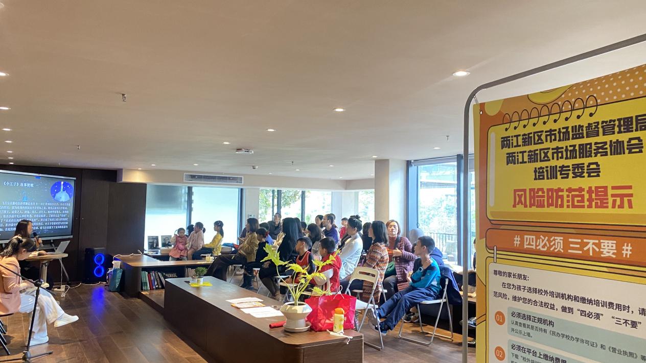 本次读书会由重庆两江新区市场监督管理局、重庆两江新区教育局指导,重庆两江新区市场服务协会承办,得到两江智慧城投 “渝付码” 平台、美团 “安心学” 项目、方知读书会、白鲸书店、远川阅读等多方力量支持。活动精准聚焦 6-12 岁亲子家庭,吸引 30 组家庭参与。在资深教育人、阅读指导师的专业引领下,亲子家庭共同探索《小王子》中的爱与责任、成长与哲思;同时,两江市场服务协会紧扣专项行动要求,现场开展校外培训合规政策宣讲,与家长交流孩子的教育,精准调研亲子家庭校外培训选择偏好、合规认知及风险防范意识宣导,为后续校外培训市场风险排查治理提供第一手参考依据。