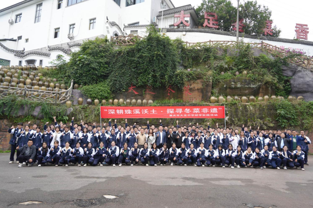 为深入推动非物质文化遗产的传承与保护,加强中学生对地方传统文化的认知与实践能力培养,2025年10月31日上午,重庆市大足中学课程发展中心、高2027届年级组,组织高二年级1、2班100余名师生,前往大足区珠溪镇鑫轩冬菜基地,开展了一场以“探寻冬菜技艺,乐享非遗文化”为主题的沉浸式研学实践活动。
