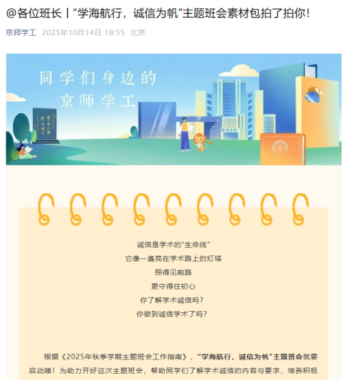 北京师范大学将诚信教育深度融入班级建设,全校各班级围绕“学海航行,诚信为帆”主题召开专题班会300余场,通过案例研讨、实践教学等形式,引导9000余人次学生树立正确诚信观念,营造了“知信、用信、守信”且“学AI、用AI”的浓厚校园氛围,持续深化校园诚信文化建设。