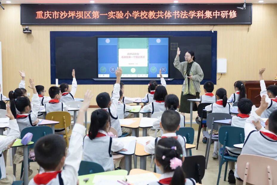 在这节扎实有趣的书法课堂上,沙坪坝区第一实验小学校三年级3班学生们的表现也格外亮眼。他们书写时专注投入,课堂中积极响应、主动反馈,不仅扎实掌握了知识与书写技巧,更以饱满的热情点亮了整个课堂,展现出过硬的课堂常规与良好风貌,赢得了在场老师的一致认可。
