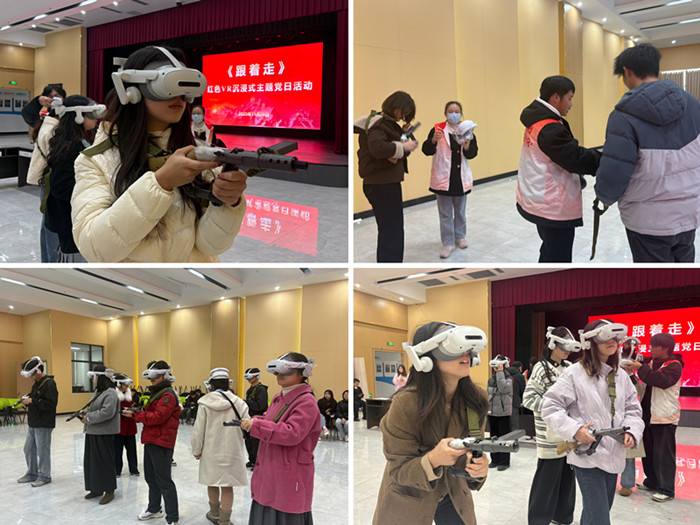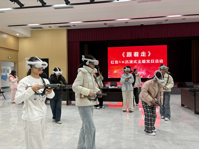 戴上VR设备,脚下的崎岖路途、耳畔的枪炮风声立刻在眼前鲜活起来。马克思主义学院思政课教师丁贝贝摘下设备后深有感触:“这场VR沉浸式主题党日活动让我身临其境地感受到了伟大的长征精神,感受非常深刻”。“刚刚在体验的过程中,看着身边的战友接连倒下了,给我的内心触动很深,我真切体会到了革命先辈们的艰辛和伟大,这种活动形式新颖又有感染力!”体育学院学生邵怡激动地说。
