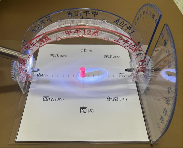 设计思路:围绕“观察记录一天中阳光下物体影子的变化”这一必做探究实验,创新开发模拟实验装置,通过运用科学原理与激光切割技术,将复杂的天文现象转化为可操作的实验,有效解决了因天气、时间等条件限制无法开展实地观测的难题,确保学生在课堂内完成影子变化规律的探究。