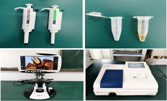 图丨微量移液器(左上)、离心管(右上)、数码显微镜(左下)、分光光度计(右下)