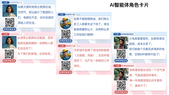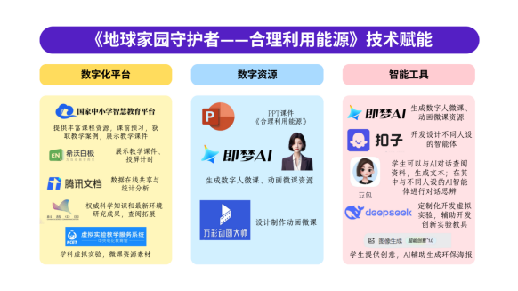 创新亮点:一是开发数字化实验教具,实时呈现多组温度数据折线图,帮助学生理解能源利用与温室效应的关联,解决传统实验读数误差大、数据不直观的问题,突破“理解能源利用对环境的影响”难点;二是创设AI智能体对话场景,引导学生从不同角色视角思考能源问题,培养批判性思维,助力提出合理用能方法,攻克“提出合理利用能源具体方法”的重点;三是整合多元数字化资源,为实验教学提供丰富支持,强化“做中学、思中学”的理念,提升学生科学实验能力。