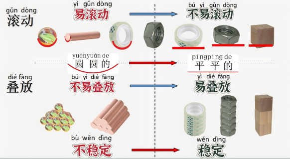 设计思路:以“帮王奶奶布置摊位”这一挑战性任务为驱动,设计“情境—探究—建构”主线,引导学生通过动手摆放不同形状的物品,直观感知“形状”与“稳定性”之间的关联。在自主探索中,建构了“物体的形状决定其性质(是否易滚动、是否易叠放),性质决定了其功能(稳定摆放的方式)”的科学观念,实现“结构—性质”模型的构建。