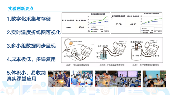 创新亮点:一是创新实验装置:采用一体设计的双层容器,结合温度传感器与数显采集器,提升操作便捷性与数据精准性,增强实验的可视化与稳定性;二是构建数据模型:摒弃传统班级记录表,让学生将折线图绘制在透明塑料片上,通过胶片叠加形成班级数据模型,支持“个体论证→交互论证→集体论证”三层论证,推动学生自主构建科学概念;三是开展深度探究:技术工具实现从温度计到传感器再到热成像仪的升级,引导学生发现“凉水反超了热水”的反常现象,通过师生咨询中科院物理学家分析误差,联合两家专业机构重复实验,证实结果普遍性,培养学生科学观。