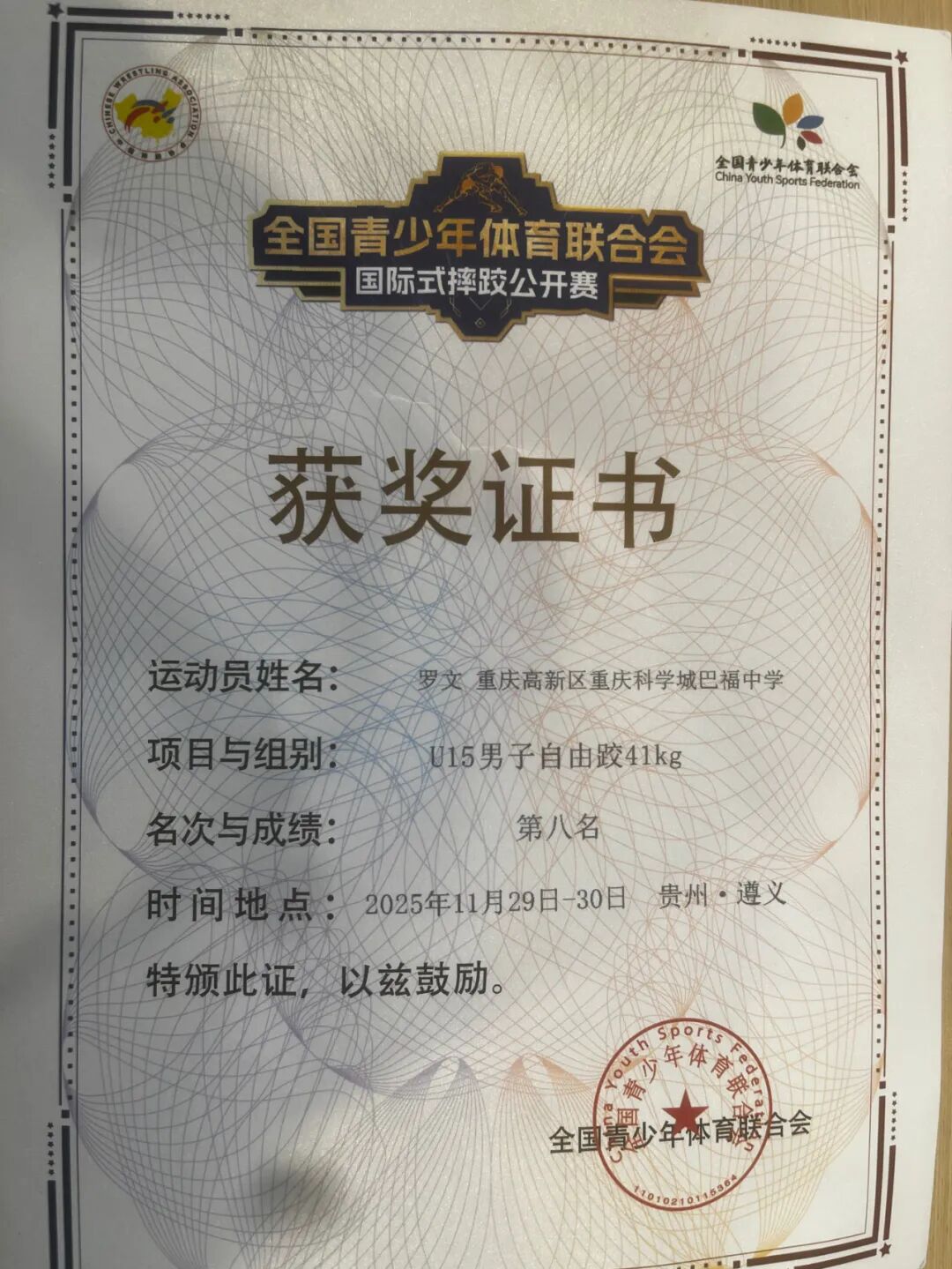 2025年11月29——30日,贵州遵义,全国青少年体育联合会,国际式摔跤公开赛赛场上,重庆科学城巴福中学校摔跤队,在教练罗世贸带领下,展示新气象,斩获前八名。