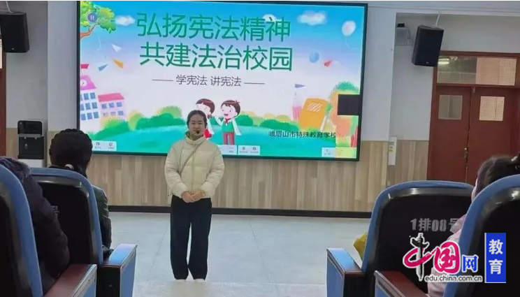 为引导培智学生树立法治意识,将宪法精神内化于心、外化于行,12月1日,峨眉山市特殊教育学校开展了以“弘扬宪法精神,共建法治校园”为主题的德育活动。