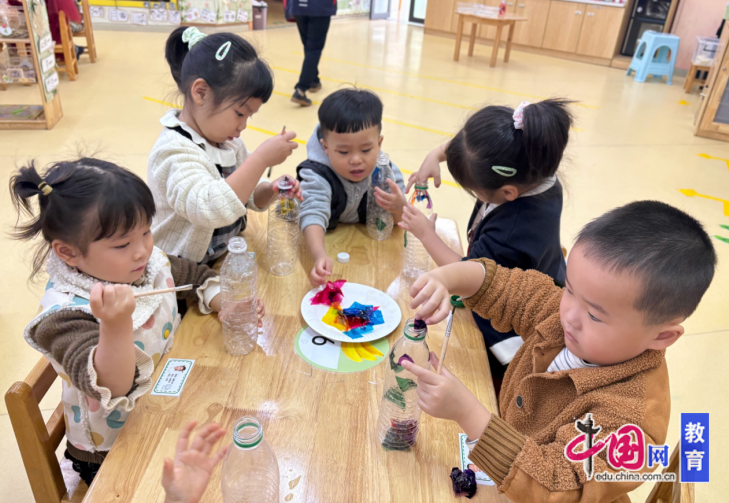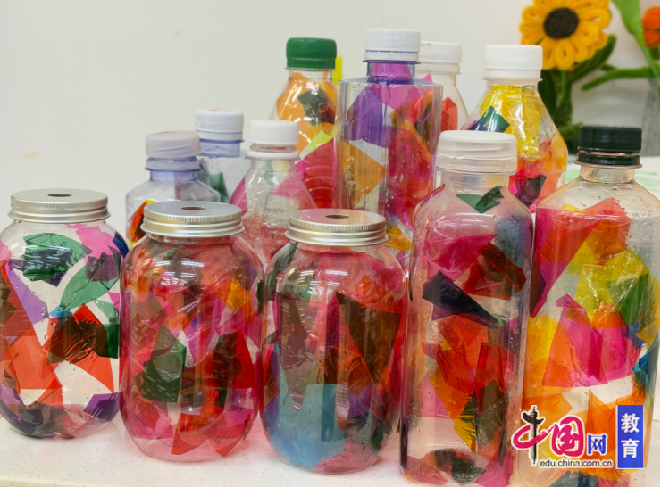 光影感官瓶制作:孩子们在透明玻璃瓶子中装入彩色玻璃纸,观察光影透过瓶身形成的流动光斑,亲手制作出独一无二的光影感官瓶。