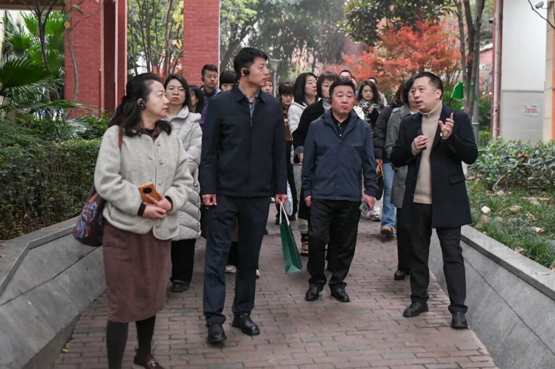 冬日的校园,暖阳正好,温情涌动。学校党总支书记宋自渝携管理团队早早伫立校门口,以最诚挚的笑容迎接远方来客。伴着清晨的琅琅书声,宋书记率全体行政干部陪同交流互学团漫步校园,逐一解读景致背后的育人密码:象征渝新同心的石榴树枝繁叶茂,台阶上“迎难而上”的石刻字句催人奋进,呵护童心的 “三朵小花”互动装置传递温暖,粉笔字墙镌刻着教师的教育初心,朗读亭里回荡着少年的意气风发,“童心农场”中孕育着生命的蓬勃生机…… 一草一木皆传情,一景一物皆育人,每一处细节都浸润着 "童心相伴,群星璀璨" 的办学理念,让远道而来的同仁们深切感受到校园文化的深厚底蕴与育人温度。