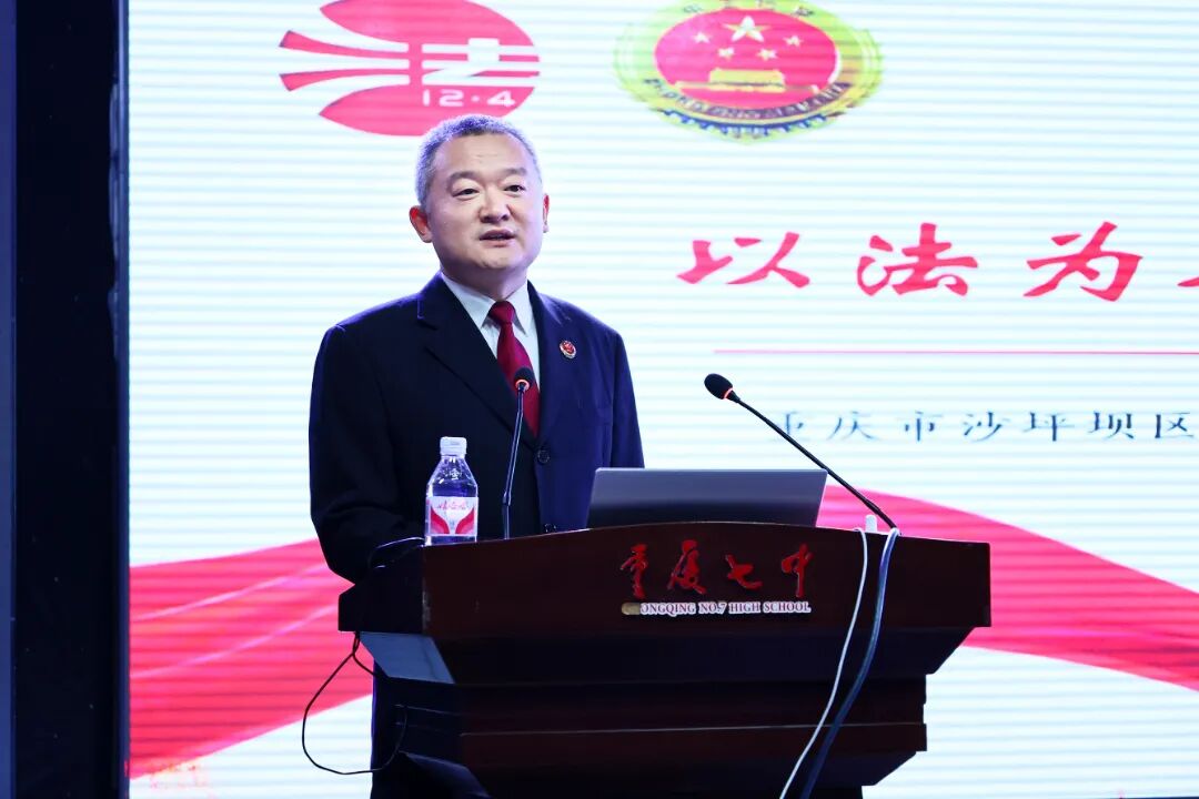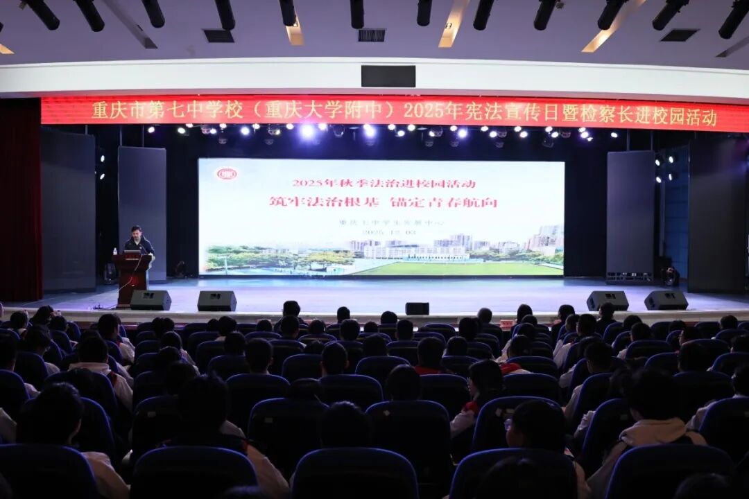 在国家宪法日到来之际,沙坪坝区检察院党组书记、检察长杨洪广一行走进七中校园,为东川学子带来了一堂面向青春、贴近生活的法治课。重庆七中党委书记刘婷婷、校长欧权、纪委书记方建、副校长韦林果等领导出席活动。杨洪广检察长首先参观了学校体育、地理、语文等市级课程创新基地以及东川校史馆,深入了解学校丰富多彩的校本课程建设与悠久厚重的东川书院文化,并对学校在文化传承、课程改革与协同育人等方面的实践探索给予了高度评价。