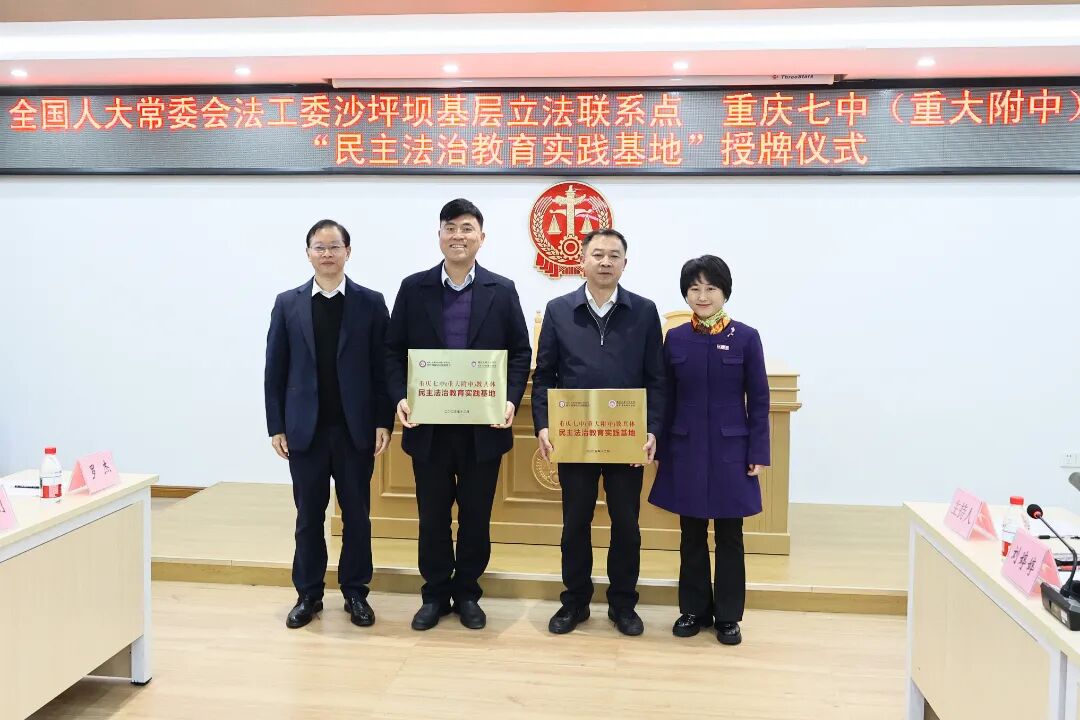在沙坪坝区委教育工委、区教委的支持推动下,全国人大常委会法工委沙坪坝区基层立法联系点与重庆七中(重大附中)教共体双向奔赴,共建“民主法治教育实践基地”,基地授牌仪式在中心湾社区举行。沙坪坝区人大监察和法制委员会、法工委主任委员江小波,沙坪坝区石井坡街道党工委书记杨勇刚,沙坪坝区委教育工委委员、区教委总督学樊丽,重庆七中党委书记、七中教共体总校长刘婷婷,以及土湾、中心湾社区基层立法联系点负责人和七中教共体思政教师代表等参加了本次活动。在热烈的掌声中,江小波主任与刘婷婷书记共同为基地授牌。