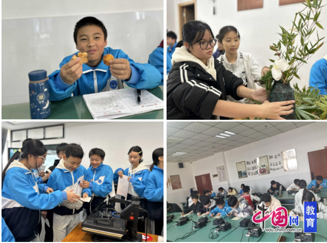 烘焙课程香气四溢,江阳区通滩镇初级中学校学生们分组协作,从称量食材到搅拌成型,从控制烤箱温度到创意装饰,完整体验了烘焙制作的全过程。当亲手制作的酥饼新鲜出炉时,同学们的脸上洋溢着收获的喜悦。东方花韵课上,同学们在专业老师指导下,学习花材选择、色彩搭配和造型设计,将采集的一枝枝普通花材巧妙组合成富有意境的艺术作品。非遗传承教室则展示了传统工艺的魅力——在烙铁画制作中,同学们屏息凝神,用温度恰到好处的电烙笔在木板上创作,焦褐色线条勾勒出的一幅幅灵动的画作……