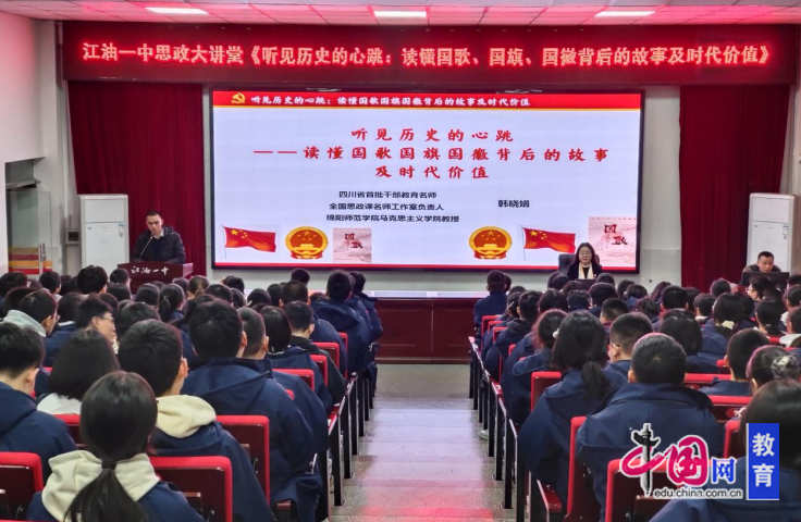 学校特邀绵阳师范学院马克思主义学院院长韩晓娟教授,为师生开展题为《听见历史的心跳:读懂国歌、国旗、国徽背后的故事及时代价值》的思政大讲堂。讲座通过线下与线上直播相结合的方式进行,高一班级代表现场聆听,其余班级在教室同步收看。韩晓娟生动讲述国家象征背后的历史脉络与精神内涵,引导学生在庄严仪式中深化对民族精神和国家意义的理解。
