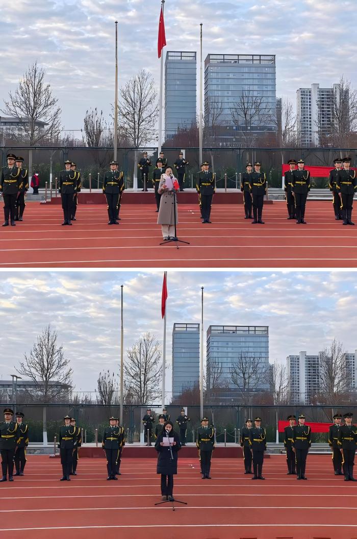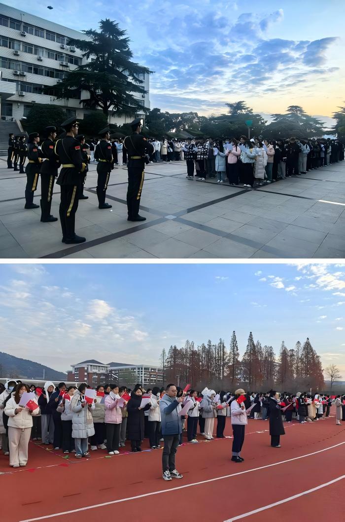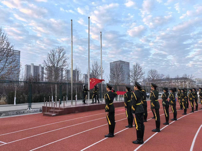 活动伊始,国旗护卫队迈着整齐划一、铿锵有力的步伐,护卫着五星红旗走向升旗台。鲜艳的五星红旗伴随着雄壮的国歌声缓缓升起,全场师生肃穆而立、高唱国歌,向国旗致敬。