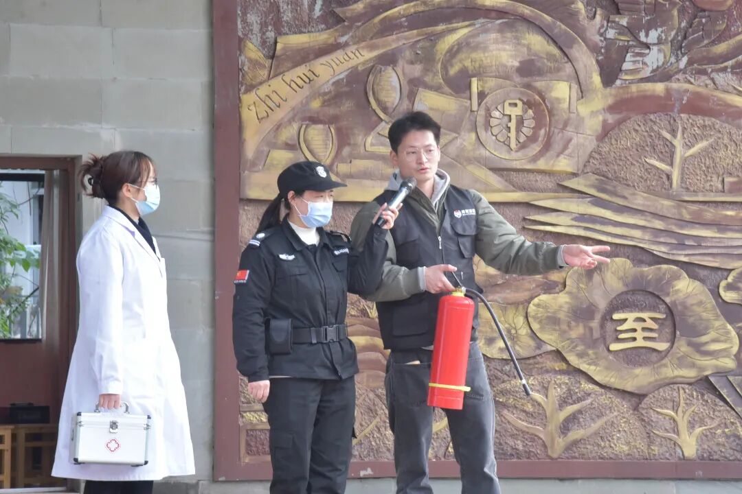 15:56警报响起,学生们按照视频所学规范动作,迅速撤离至操场,楼层引导员沿途疏导分流,仅用10分钟就实现全员集结。最令人期待的实操环节中,保安师傅和学生代表在消防专业人员的指导下,亲手操作灭火器扑灭模拟火点,“提瓶、拔销、对火源、压把手”每一步都有条不紊,直观掌握灭火核心技能。