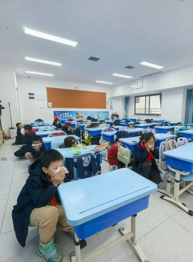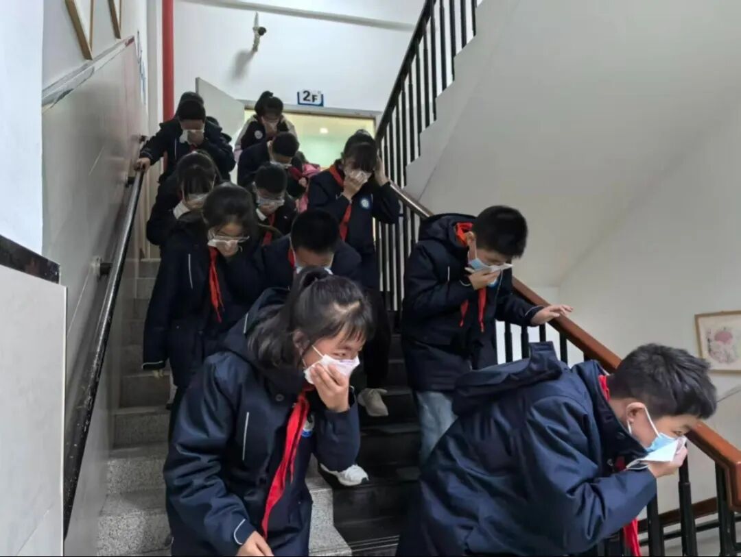 09:15警报拉响,学生们立刻用提前准备好的湿毛巾捂住口鼻,猫腰前行。各班班主任坚守“殿后”原则,逐一确认教室无滞留学生后才撤离。途中,模拟“学生摔倒”场景突发,现场师生迅速止步示警,近处同学及时上前帮扶,完美践行了演练前的要求。
