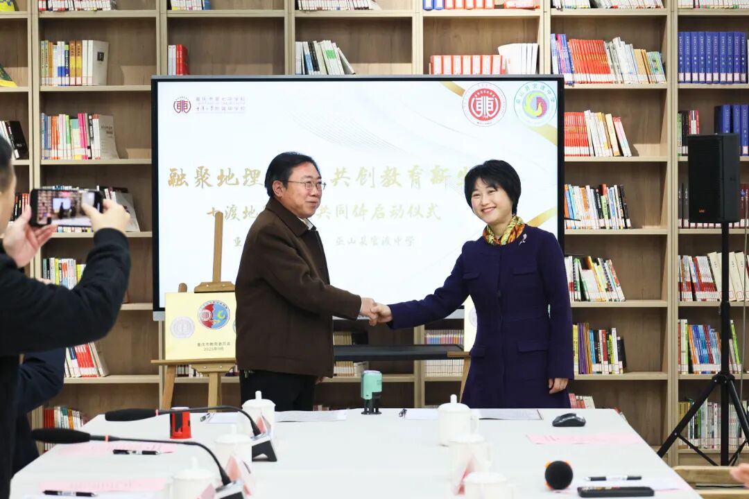 启动仪式上,主持人介绍活动背景与参会嘉宾,深入解读“课共体”政策内涵。随后,重庆七中党委书记刘婷婷和巫山县官渡中学书记刘迪生共同为“七渡地理融创共同体”揭牌,明确课程共建、师资共育、实践共行三大核心任务,包括联合开发《学校地理生活实践》等课程、推行名师走教与师徒结对、开展跨校研学等具体内容。