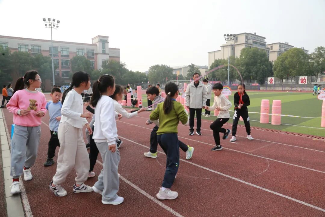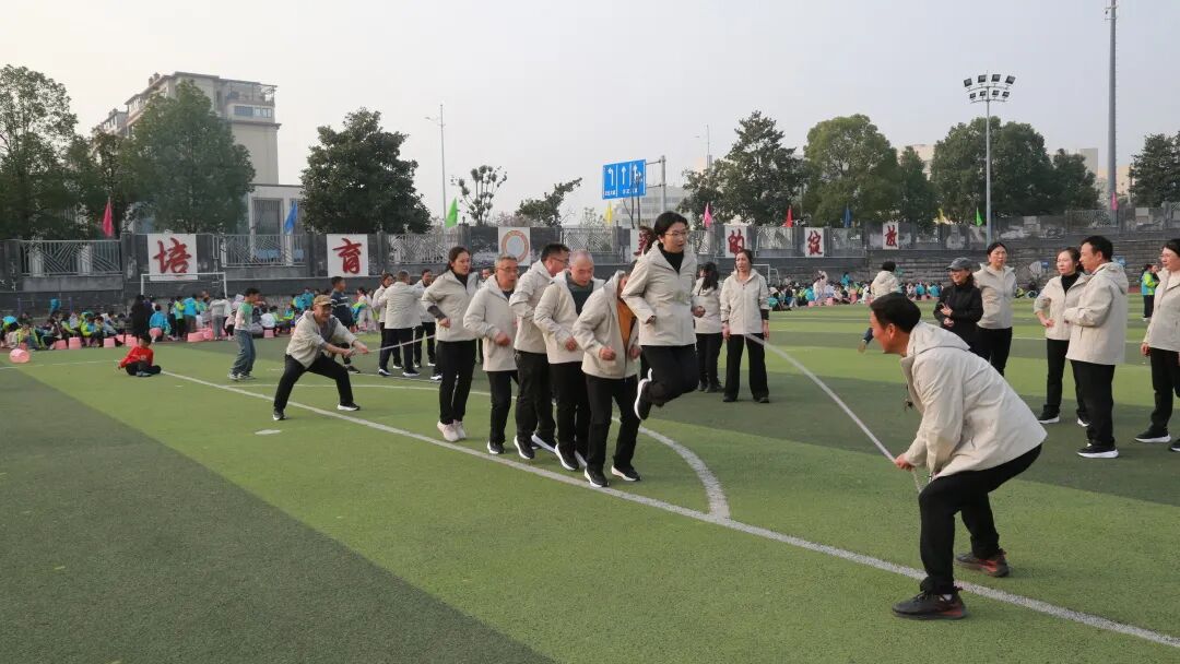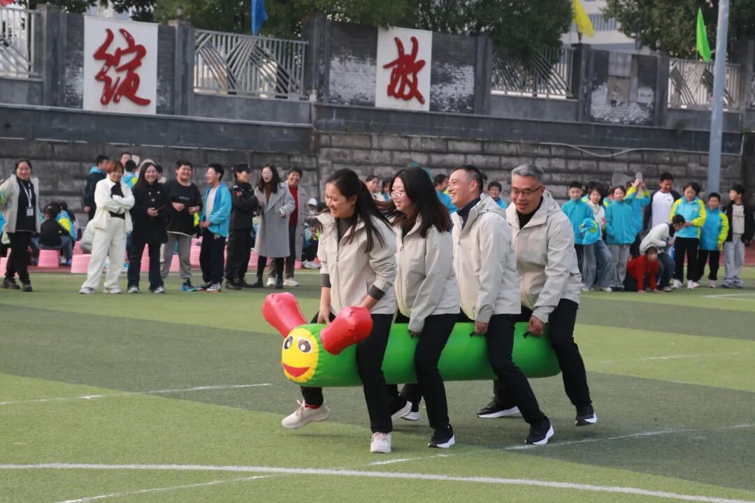 教职工趣味活动同步开展,设置了“毛毛虫竞速”“集体跳大绳”兼具趣味性与协作性的项目。平日里深耕讲台的老师们卸下疲惫,化身活力满满的运动员,以年级组为单位展开角逐。“毛毛虫竞速”项目中,老师们步调一致、齐声喊号,踩着充气道具同步向前。