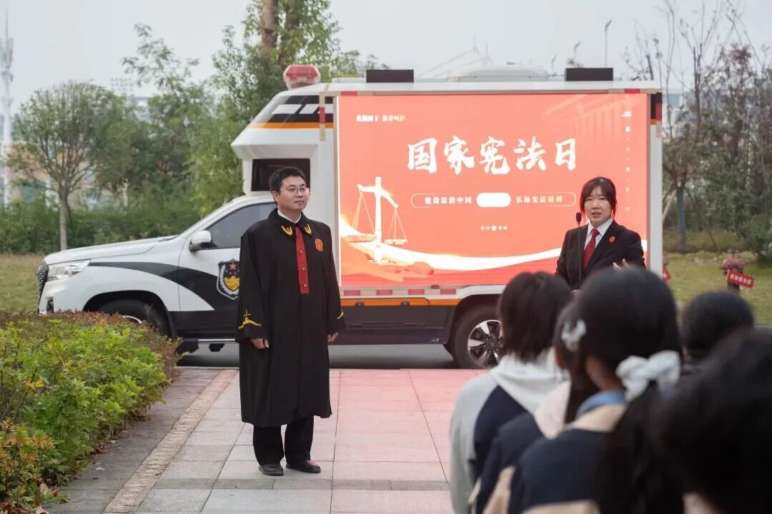 活动现场,江津区人民法院将“5G车载便民法庭”开进校园,打造了一堂移动的普法课。作为本次活动的“重头戏”,在揭院长的带领下,法院干警与同学们一同走近这台“移动的法治阵地”,近距离了解其设备配置与具体功能。